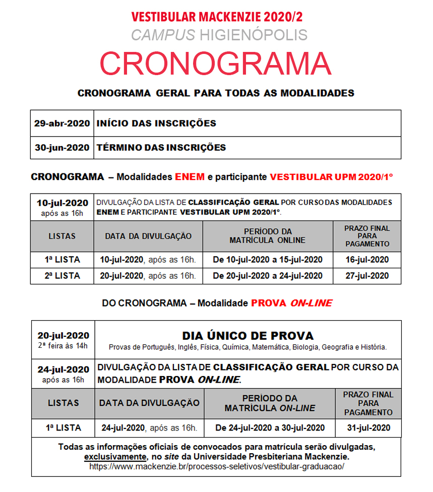 Mackenzie tem inscrições abertas para vestibular 2020/2, as inscrições começam hoje, 04 de junho de 2020, Antes de encaminhar a sua proposta de inscrição para este Processo Seletivo confira o Edital.